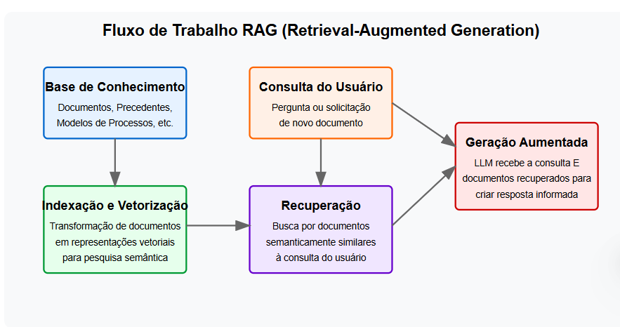 O RAG representa uma evolução significativa na aplicação de inteligência artificial para ambientes jurídicos. Ao combinar a capacidade generativa dos LLMs com a precisão factual de uma base de conhecimento estruturada, o RAG possibilita a automação da criação de documentos mantendo a aderência a precedentes e padrões institucionais.
